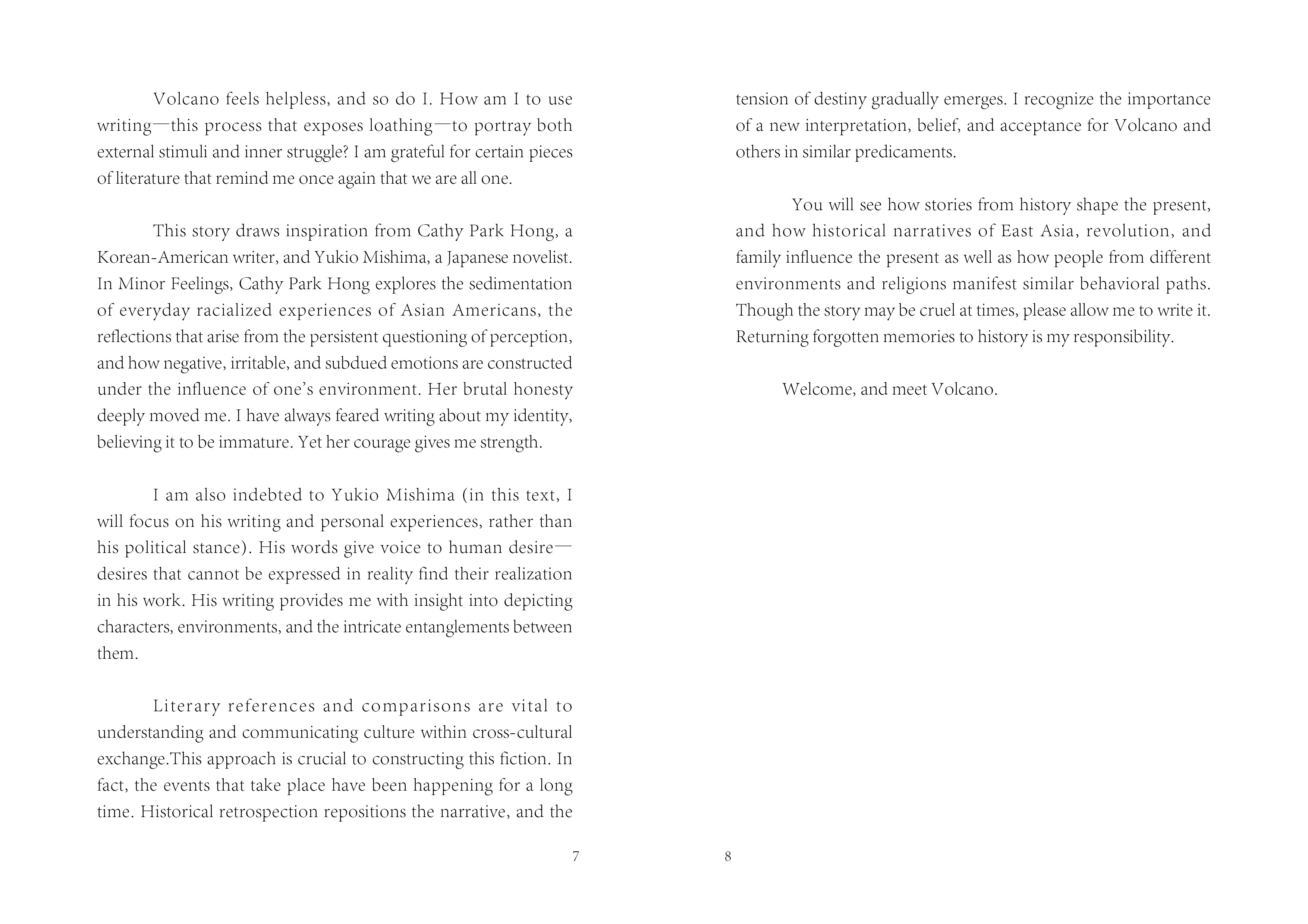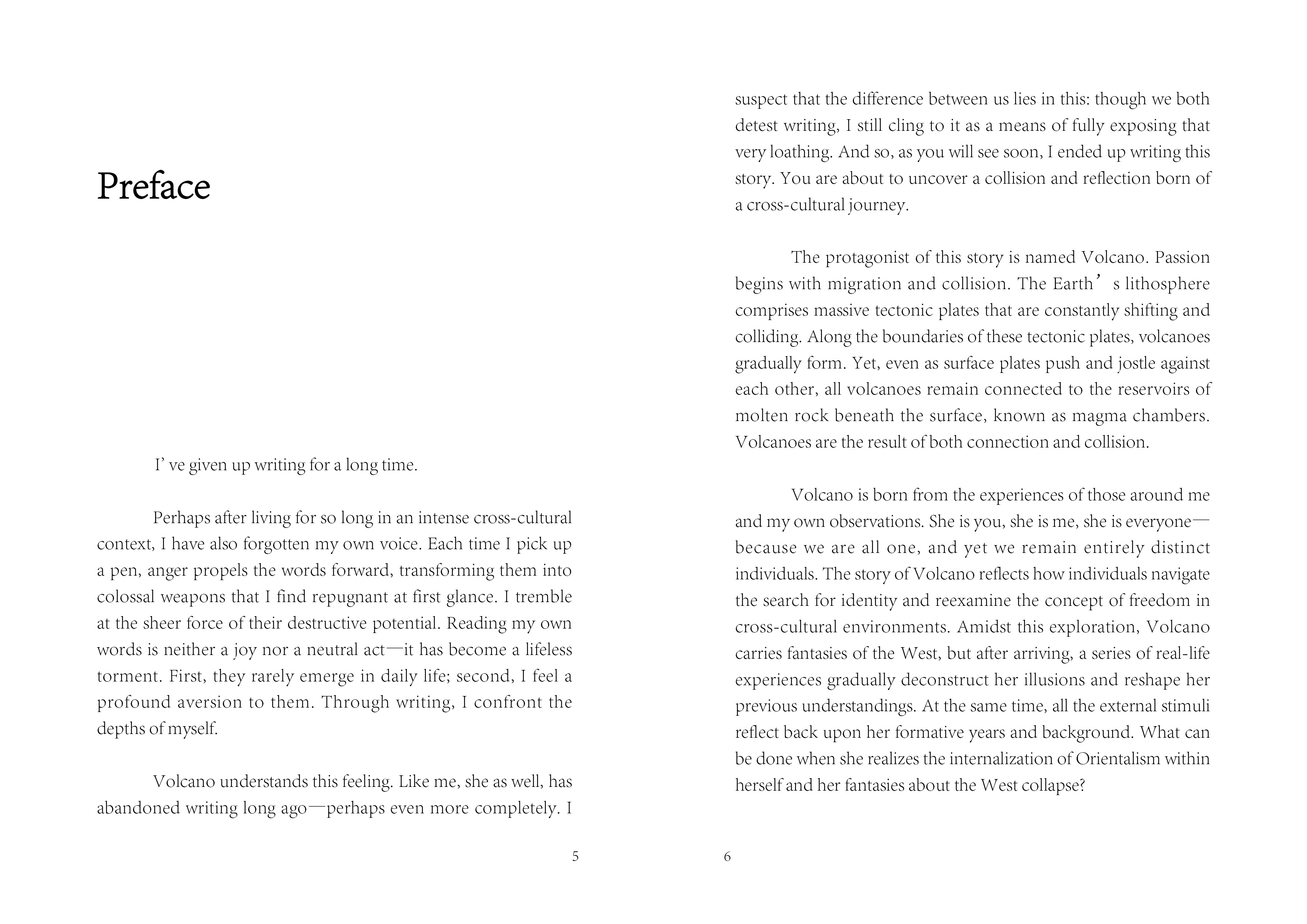 A Falling of Volcano explores the theme of Asian women seeking identity and freedom within cross-cultural contexts. Through the journey of the protagonist, Huoshan, the story delves into a wide range of issues including the tension between fantasy and reality, freedom, identity, cultural conflict, and social concerns. Huoshan’s journey becomes a site of struggle between her internalized Orientalism and her disillusionment with Western culture. Drawing from the author’s observations, interviews with friends, and reflections on lived experiences, the story captures the nuances of a cross-cultural existence. Huoshan’s experiences prompt a deep reckoning with her own upbringing, racial consciousness, and the intense self-loathing that arises in different cultural frameworks, ultimately opening a broader discussion on acceptance and belief